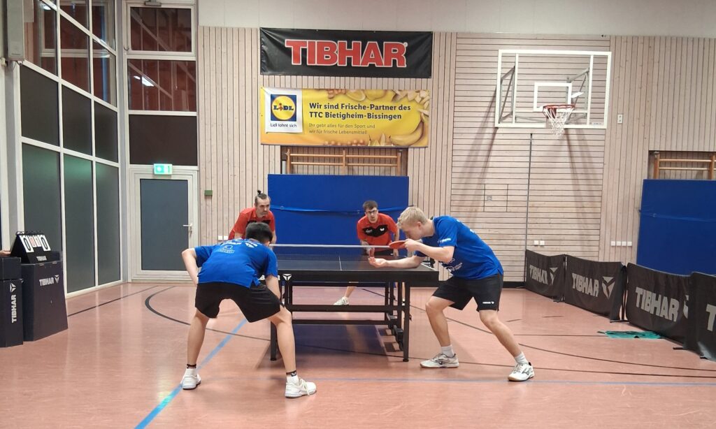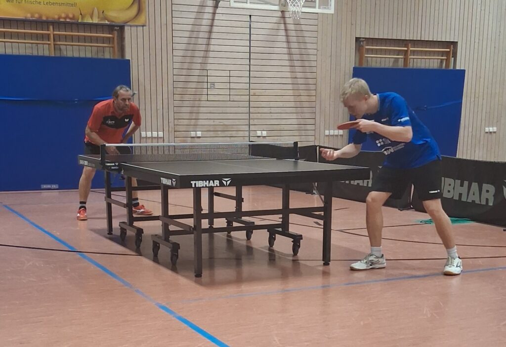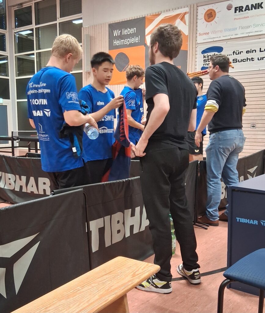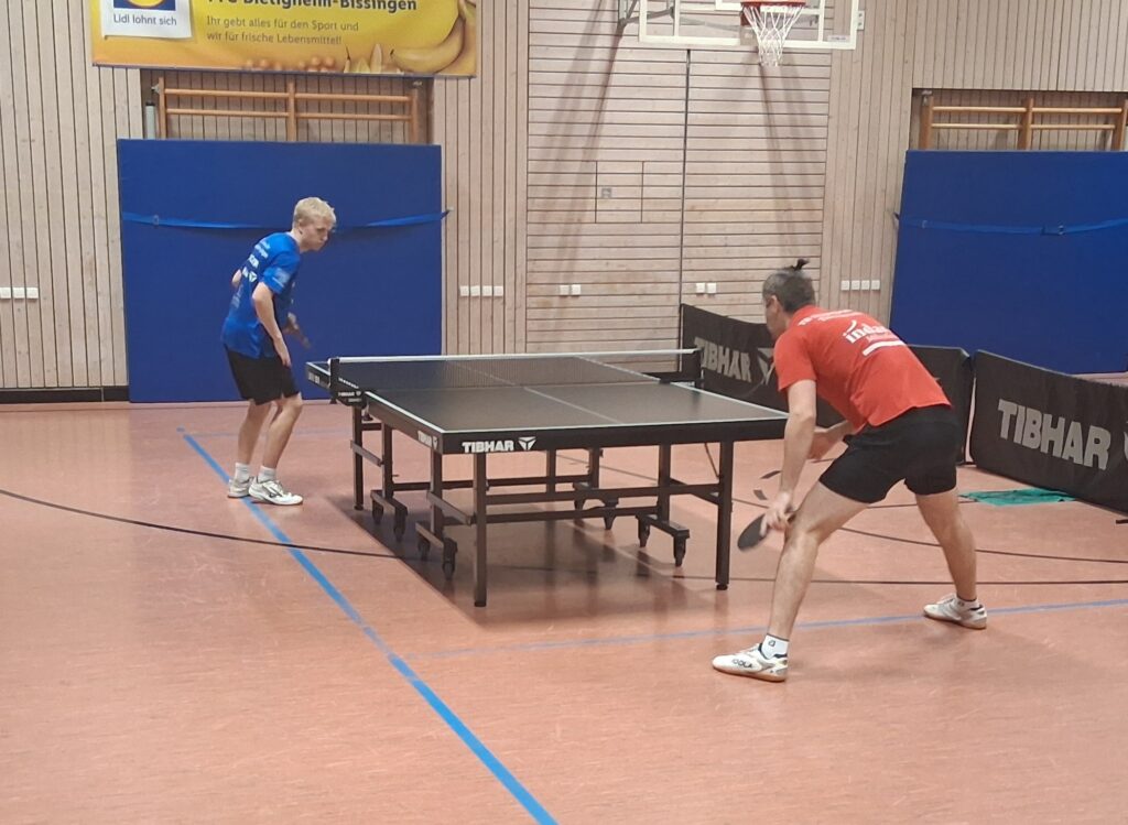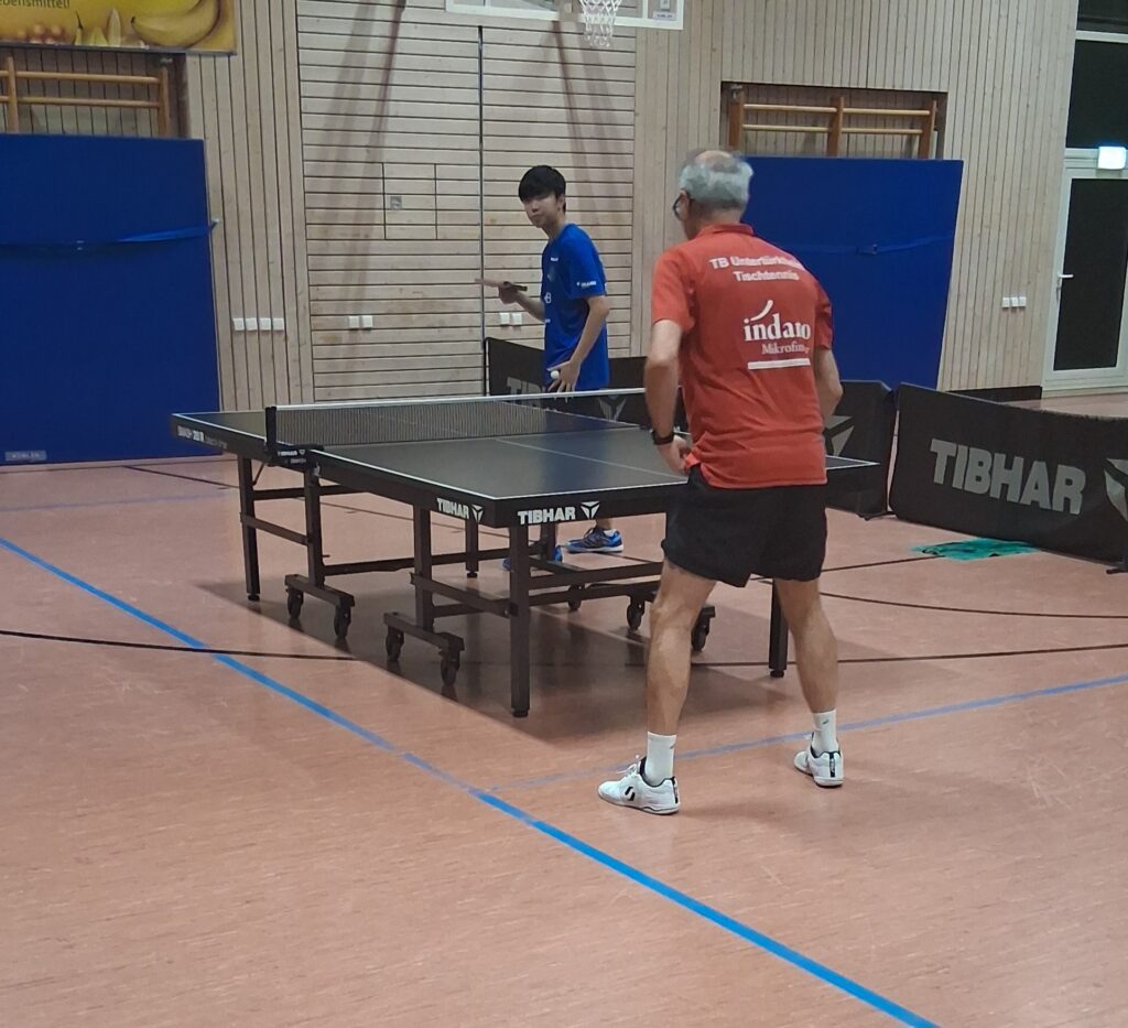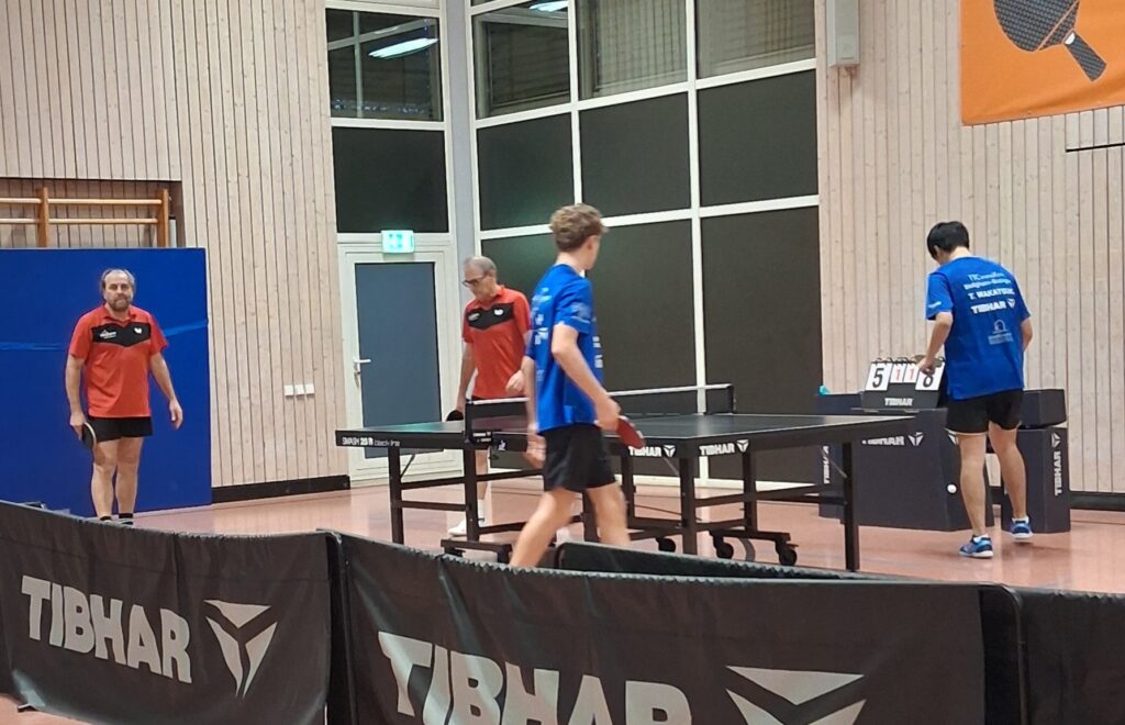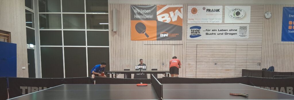 Und damit man gleich mit dem maximalen Erlebnis einsteigt, gehen beide Doppel in den Decider. Schiedlich friedlich ging man just aus diesen raus. Während Oldie-but-Goldies Basaric/Dordevic das Winner-Double Wakatsuki/Müller in den Abwehrsog trieben, revanchierten sich am Nebentisch Phong/Colvin für den TTC zum 1:1-Zwischenstand.