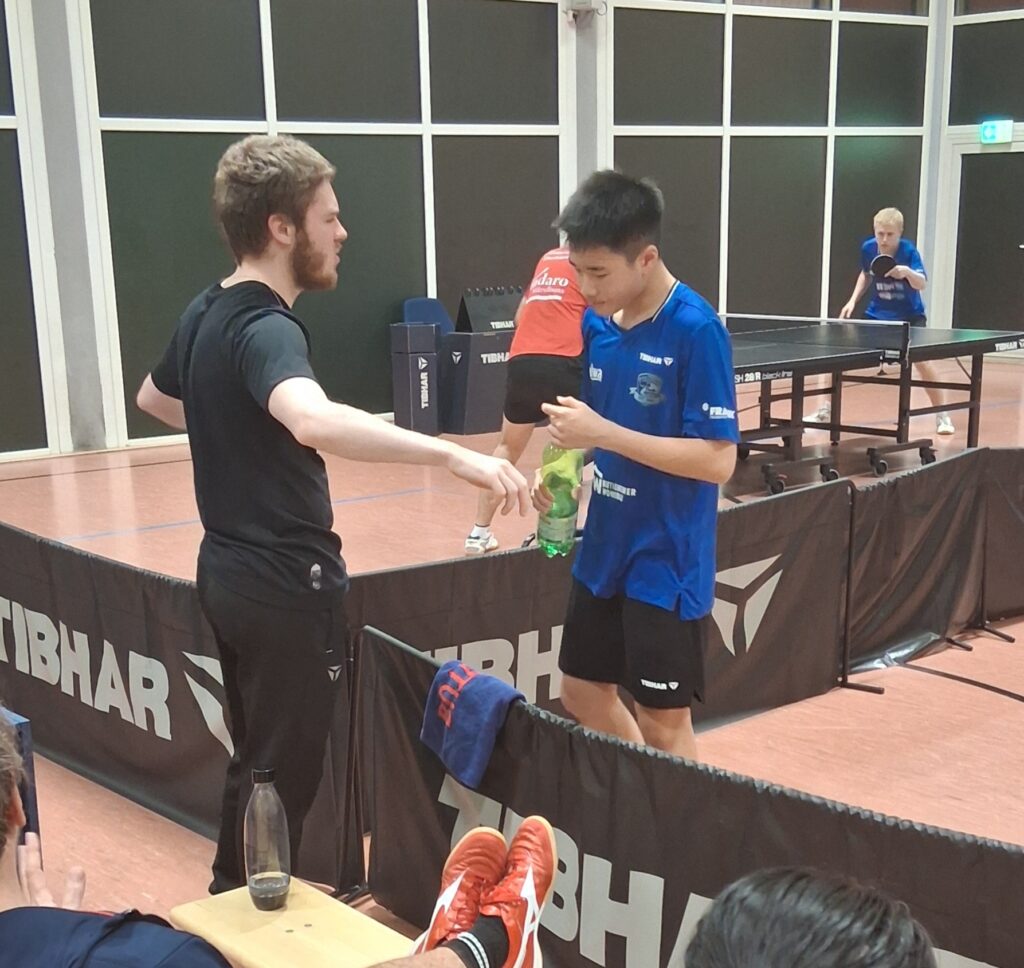 Wakatsuki mit Schönberger-japanisch bzw. Theo’scher Übersetzung zum Sieg gegen Harencak. Natürlich auch im 5ten. Und damit das so weiterging, auch Phong im Duell mit Basaric in fünf. Relativ souverän nach 0:2-Sätzen, 0:6 und 2:8 im Entscheidungssatz, um am Ende mit 13:11 den Sieg heimzuschaukeln. Spiel für die Galerie war es definitiv nicht, aber für die Zuschauer.